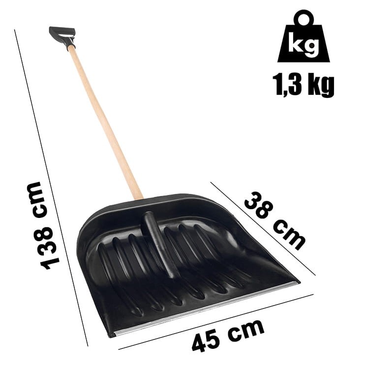 - Szerokie ostrze: Szerokość 45 cm pozwala na efektywne odśnieżanie dużych powierzchni, a całkowita wysokość łopaty wynosząca 138 cm umożliwia wygodną pracę bez nadmiernego schylania się.