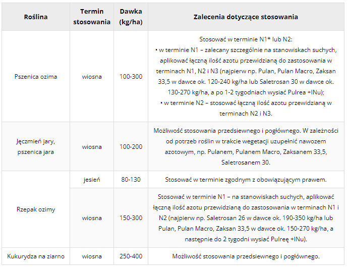 Orientacyjne dawki nawozu Pulrea® +INu w kg/ha