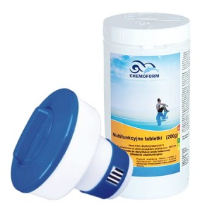 Stały preparat chlorowy w formie tabletek (200g) multifunkcyjnych 6w1 firmy Chemoform przeznaczony do dezynfekcji wody basenowej. Zawiera ok. 90% aktywnego chloru. Bardzo wolno się rozpuszczają.