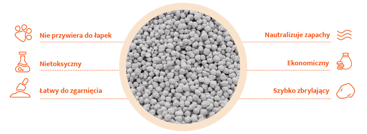 Czyste mieszkanie: Specjalna formuła sprawia, że żwirek nie przywiera do łapek , dzięki czemu Twój pupil nie roznosi go po całym domu.